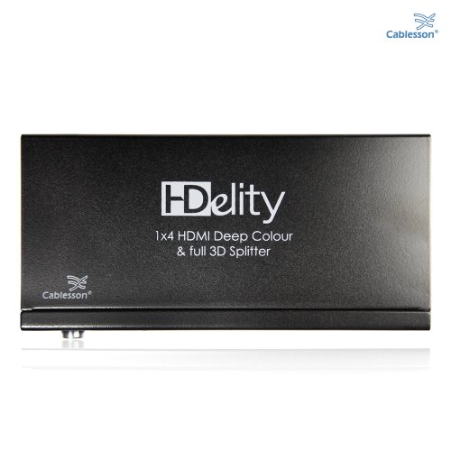 Description : The NEW 1x4 hdmi splitter by Cablesson, you can display identical image on four(4) displays from one(1) source equipment with HDMI port. Connect One HDMI sources to up to four HDTV display devices maintaining 480i, 480p, 720p, 1080i and 1080p resolutions the highest HDMI single link video resolution and digital audio signal supporting HDCP compliant devices. HDMI or DVI-HDMI cables are used to connect to the input and splitter outputs. Withthe 1x4 hdmi splitter active output channels are displayed on the front panel LED's , which are automatically activated when a cable is connected to the corresponding output and can be connected in series with a Cablesson 1x4 HDMI splitter for connection of a single sources to multiple display devices. It can split multi-channel, high resolution audio formats such as PCM, Dolby Digital, and DTS 7.1. (*)To ensure optimum performance, you should use Cablessons high quality cables with this product Specifications Version 1.3a/b/c Deep Colour Support 36 bit Full10.2 Gbps Works with HDMI or DVI-D, HDCP-enabled HDTV Supports high resolution video 480p, 720i/p, 1080i/p Easy to split 1 HDMI or DVI-D source totwo displays. Backward compatible with DVI-D Support digital audio split, such as LPCM/Dolby-AC3/DTS7.1/DSD Sky 3D Support added