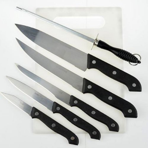 Title : Set coltelli 7 pezzi in acciaio inox (5 coltelli, 1 tagliere, 1 affila coltelli)ASIN : B0042F0H1G